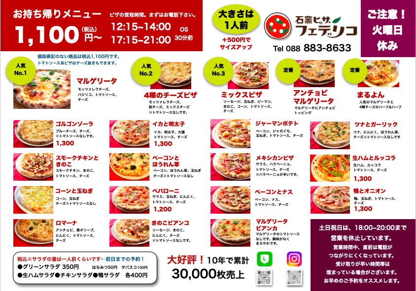 土日祝日の18:00〜20:15頃まで、テイクアウトピザは休止しています。